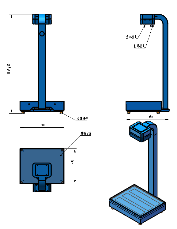 整機機架,烤漆或噴塑;測量模塊(測量鏡頭、數(shù)據(jù)線、軟件狗);稱重模塊(顯示儀表、稱重傳感器、數(shù)據(jù)線、電源適配器);掃碼槍