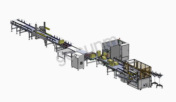 自動開箱→自動90度翻轉(zhuǎn)→自動側(cè)推裝箱→自動90度翻轉(zhuǎn)正→自動掃描→自動實時打印貼標(biāo)→自動折蓋封箱→自動貼上下防拆標(biāo)→自動碼垛→完成。