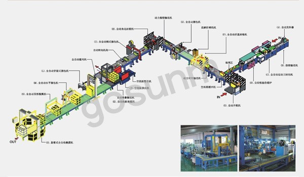 從自動(dòng)發(fā)料→自動(dòng)封切→自動(dòng)收縮→自動(dòng)開箱→自動(dòng)裝箱→自動(dòng)稱重→實(shí)時(shí)打印貼標(biāo)機(jī)→自動(dòng)折蓋封箱→自動(dòng)四角邊封箱→自動(dòng)工字型捆扎→自動(dòng)轉(zhuǎn)向→碼垛系統(tǒng)→自動(dòng)棧板打包→全自動(dòng)穿劍式捆包機(jī)→自動(dòng)水平捆扎→自動(dòng)頂部覆膜機(jī)→自動(dòng)在線纏繞→完成。